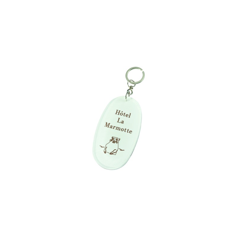 Porte-clés personnalisé en altuglass de hauteur 105mm sur largeur 50mm, épaisseur 10mm pour un poids de 80 gr forme ovale-oblongue