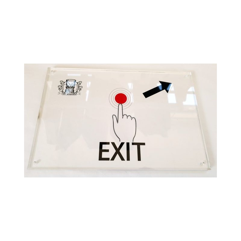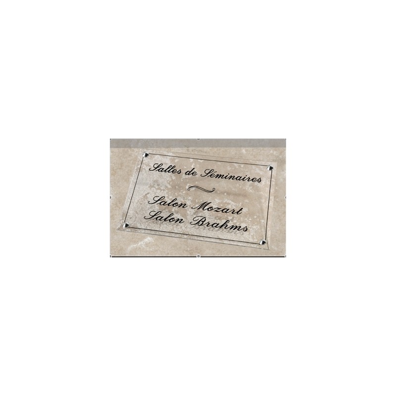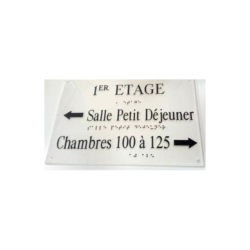 Plaque directionnelle en plexi transparent épaisseur 8mm de dimension 300 x 200 mm pour une signalétique en altuglass transparent massif imitation verre design et moderne Gravure de vos textes et numéros au choix sans frais supplémentaires Fixation à vis et entretoise fournis Merci de nous adresser tous les documents nécessaires à votre personnalisation (texte, etc...) à info@rgf-hotellerie.fr