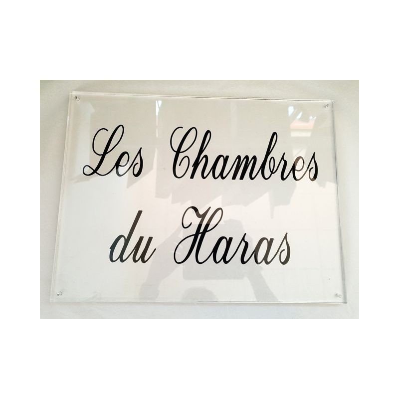 Plaque directionnelle en plexi transparent épaisseur 5mm de dimension 300 x 200 mm pour une signalétique en plexi transparent massif imitation verre design et moderne Gravure de vos textes et numéros au choix sans frais supplémentaires Fixation à vis et entretoise fournis